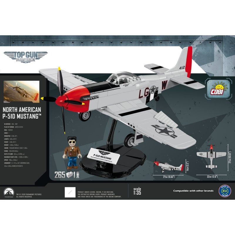 Der Mustang P-51D ist ein Bausteinmodell aus dem Film, der unter der ursprünglichen TOP GUN: Maverick ™ -Lizenz veröffentlicht wurde. Die Hauptfigur des Films, Maverick, ist stolz darauf, dieses historische Flugzeug zu fliegen. In Erwartung der Veröffentlichung des Films können Sie jetzt Ihren eigenen Mustang im Modellmaßstab 1:35 bauen. Das Set wurde originalgetreu aus 265 COBI-Bausteinen reproduziert. Im Set finden Sie hochwertige Drucke und Aufkleber, die das original Abbild des Filmflugzeugs genau wiedergeben. Das Modell ist mit rotierenden Propellern, versenkbaren Fahrgestell, beweglichen Rädern und einem sich öffnenden Kabinendach ausgestattet, in dem Sie unsere von der Hauptfigur des Films inspirierte Sonderfigur platzieren können. Es enthält auch einen eleganten Displayaufsteller und eine Plakette mit dem Namen des Flugzeugs und dem Filmlogo.